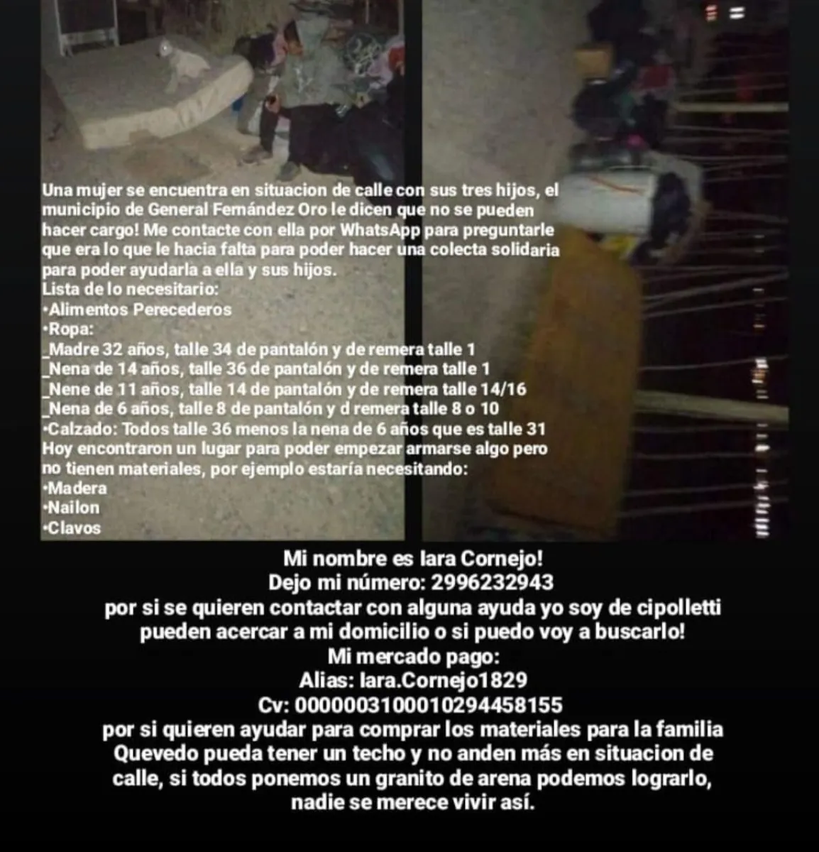 Pide ayuda a la comunidad ya que desde el Municipio de Fernández Oro manifestaron que, al tratarse de una toma y desalojo, no pueden avalar la situación ni tomar mayores medidas.
