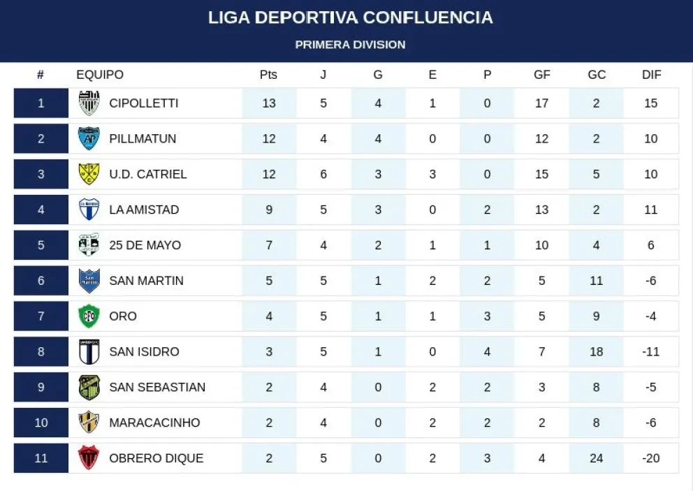 Transcurridas seis fechas del torneo de la Liga Deportiva Confluencia, los equipos de la ciudad siguen mandando en la table de posiciones. El equipo “liguista” de Cipolletti es el que marcha puntero, con 13 unidades en cinco partidos (cuatro triunfos y un empate).
