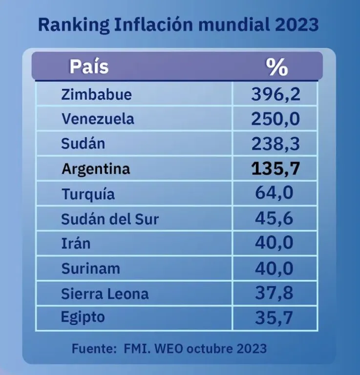 El Fondo Monetario Internacional (FMI) modificó sus pronósticos para la Argentina, y según la actualización de su informe de proyecciones económicas mundiales, el organismo espera que la inflación argentina sea del 135,7% en 2023.