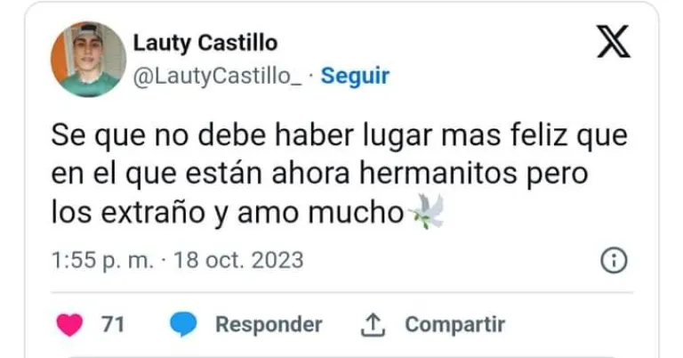 "Sé que no debe haber lugar más feliz que en el que están ahora hermanitos, pero los extraño y amo mucho", escribió Castillo en su cuenta de Twitter, dejando ver el dolor que embarga su corazón en estos difíciles momentos.