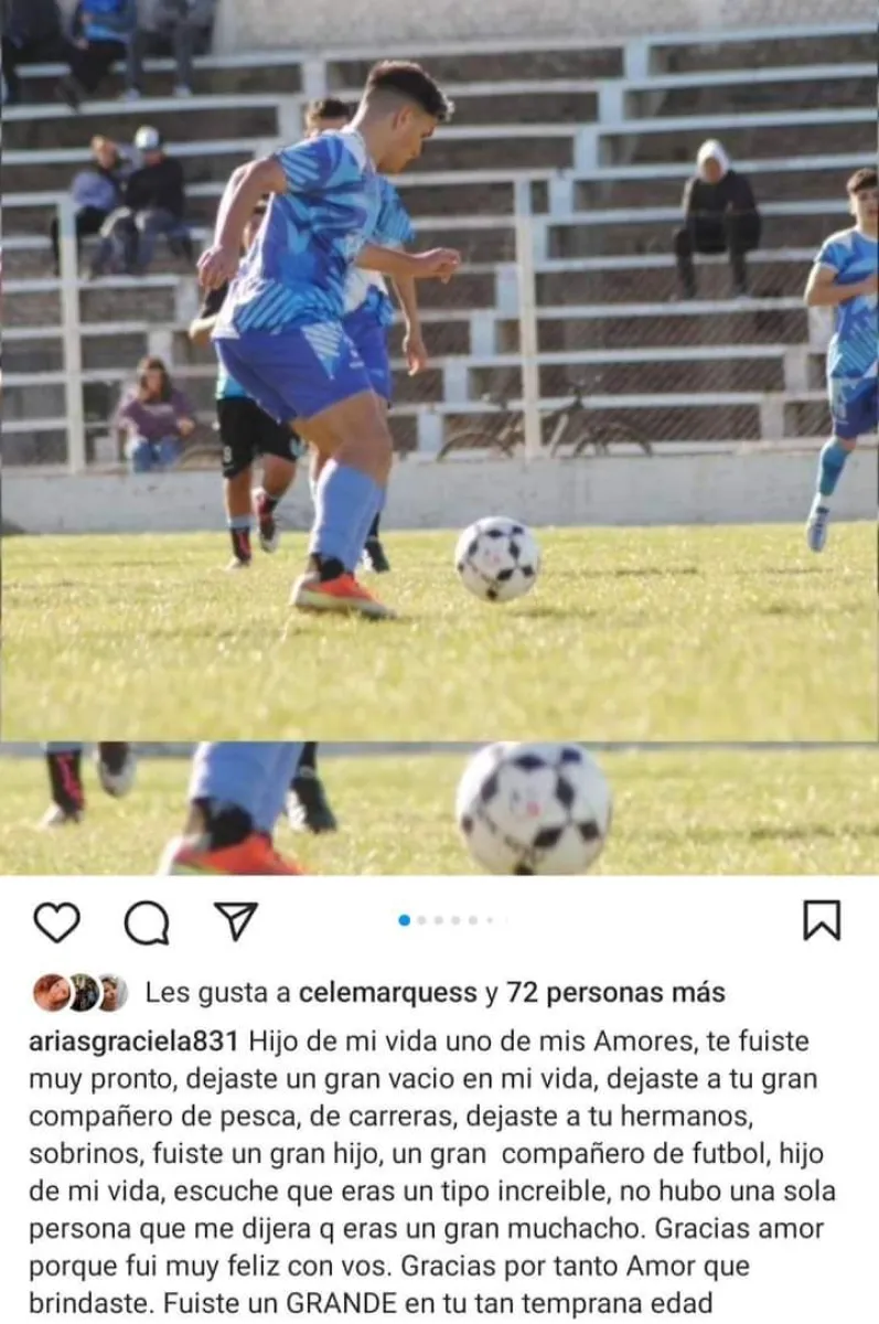 “Hijo de mi vida, uno de mis Amores, te fuiste muy pronto, dejaste un gran vacío en mi vida”, así comienza el texto de esta madre que no encuentra consuelo para tan inexplicable dolor. El fútbol, la pesca, sus sobrinos, hermanos, también aparecen en la publicación que busca graficar quién era Felipe.