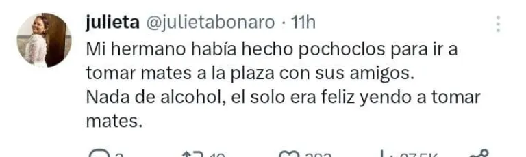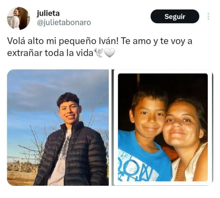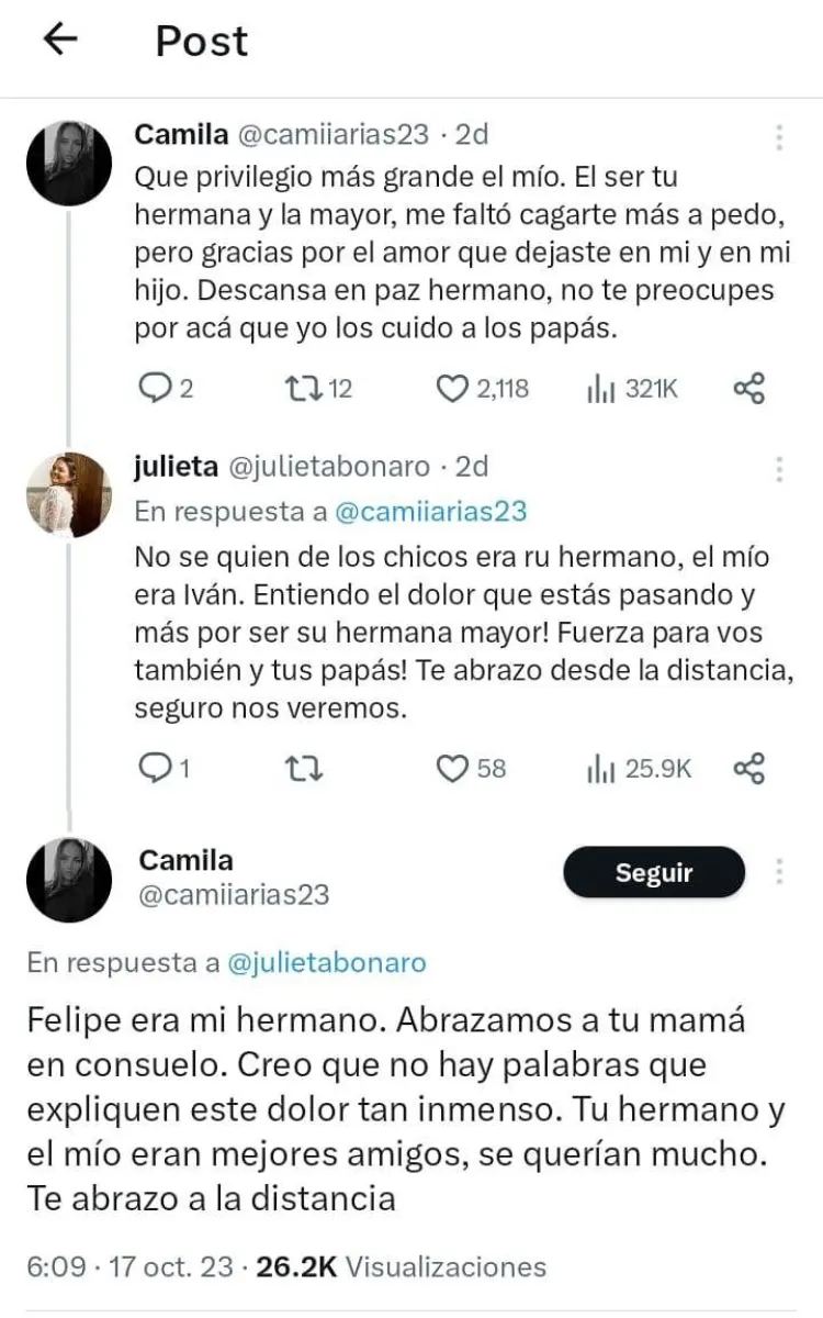 También su hermana Camila publicó en su cuenta de X (ex Twitter) sobre su tristeza y la pérdida. Y por esas cosas que tienen de bueno las redes, tuvo un intercambio con Julieta, hermana de Iván Bonaro, otro de los adolescentes fallecidos en la tragedia de calle Alem.