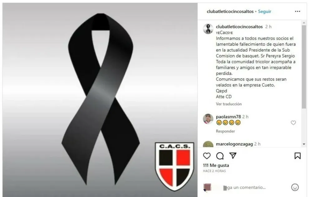 Se trata de Sergio "Poron" Pereyra, presidente de la Subcomisión de Básquet del Club Cinco Saltos. Desde la entidad deportiva informaron lo ocurrido mediante comunicado y a través de las redes sociales. “Padre, jugador, dirigente, hincha fanático de nuestro club, y sobre todo una gran persona. Nuestro más sentido pésame a toda su familia», expresaron.