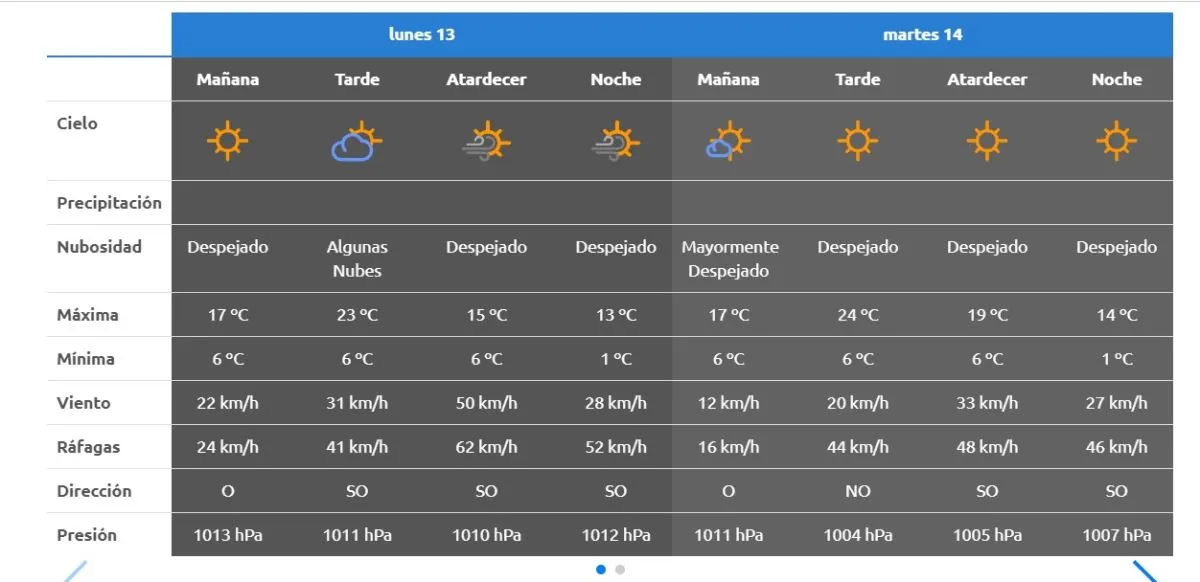 El miércoles también se pronostica un cielo con algunas nubes y vientos intensos. La temperatura mínima será de 7 grados y la máxima de 24, con ráfagas de hasta 55 km/h. Durante la noche, se espera una mínima de 10 grados y una máxima de 16, con ráfagas de viento que pueden llegar a alcanzar los 64 km/h.