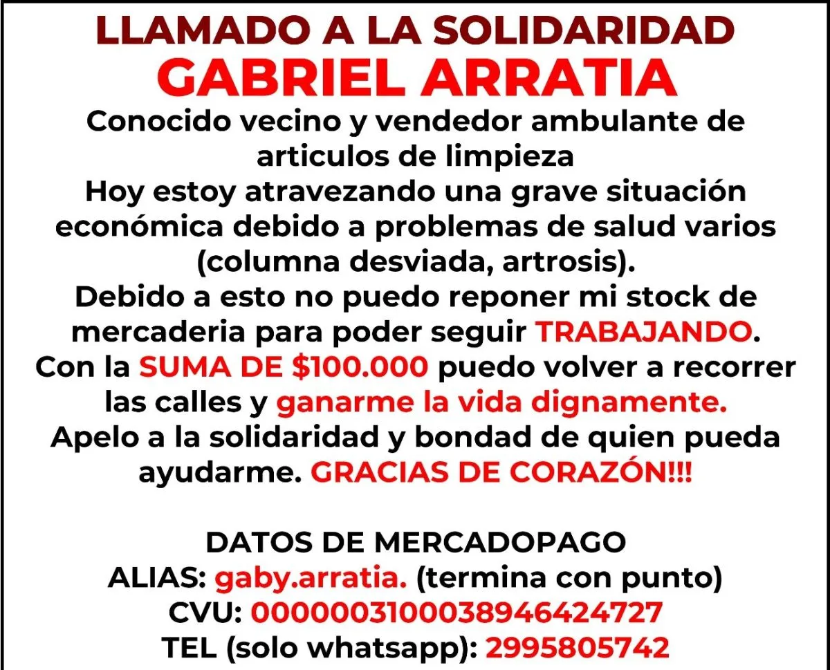El pedido hacia la comunidad es para que Gabriel pueda reunir dinero y poder reponer el stock de la mercadería, vende artículos de limpieza. Lo que el pide es poder seguir trabajando y para tal fin debe contar con unos 100 mil pesos y abastecerse de los productos.