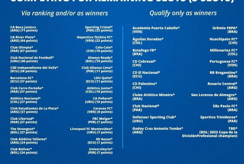 El tercero que aparece, sin contar a los brasileros que ya están clasificados, es Olimpia de Paraguay, que tampoco participará de la Copa Libertadores 2024, y en cuarto lugar, con chances de conseguir el boleto, es Nacional de Uruguay, que si participa pero deberá superar dos fases previas antes de alcanzar la fase de grupos.