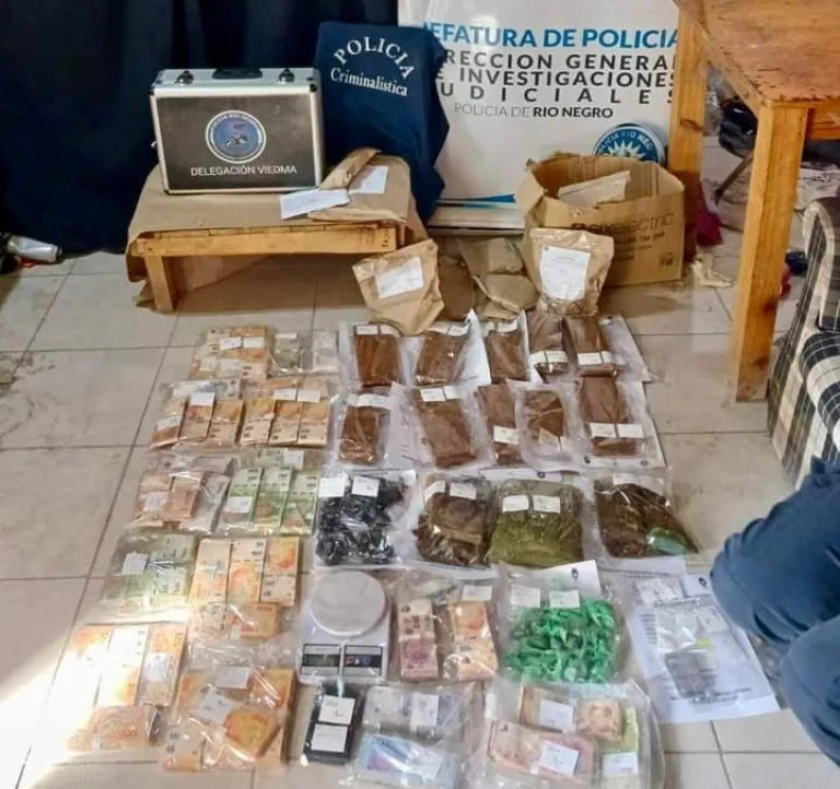 En Viedma, se detuvieron a tres individuos y se incautaron 10 ladrillos de marihuana, cocaína, 5 armas de fuego, pastillas, teléfonos celulares, balanzas digitales, un vehículo y 3.500.000 pesos en efectivo.
