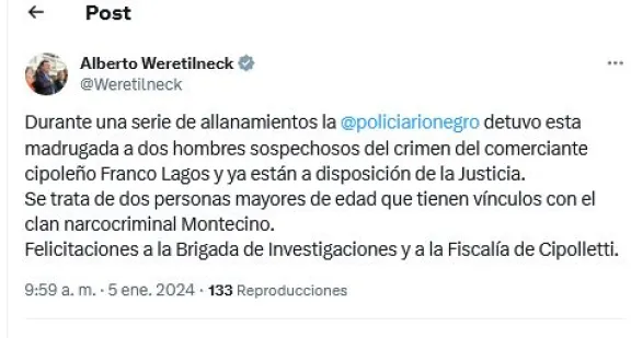 Los dos detenidos por el crimen del comerciante de Costa Norte “tienen vínculos con el clan narcocriminal Montecino”, según reveló el propio gobernador Alberto Weretilneck en su cuenta de la red social Equis (ex Twitter).