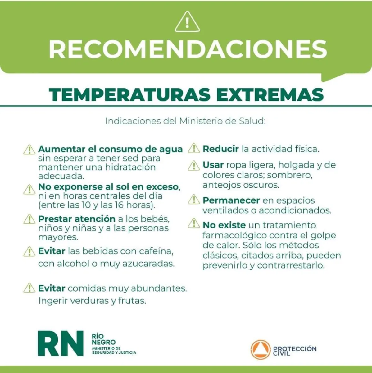 Ante este pronóstico, desde el Ministerio de Salud rionegrino reiteraron una serie de recomendaciones para evitar que la ciudadanía sufra algún golpe de calor o una descompensación producto las altas temperaturas.