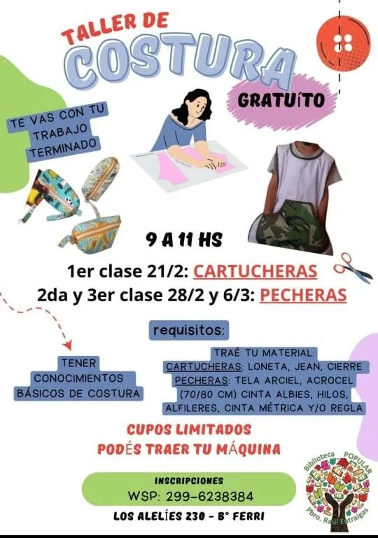 Los interesados pueden anotarse acercándose a la sede de la biblioteca Entraigas, Los alelíes 230, de 8.30 a 14.40. También se pueden comunicar por WhatsApp al 2996238384.