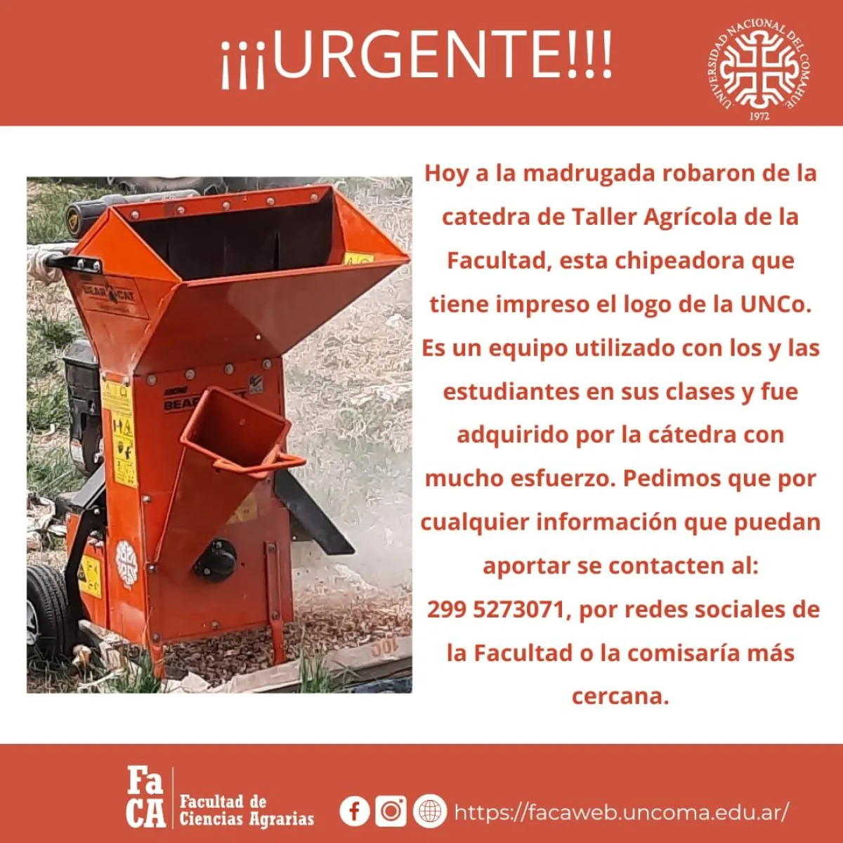 El comunicado difundido por la Facultad de Ciencias Agrarias a través de sus redes sociales ha dado cuenta del suceso. Durante la noche, intrusos lograron ingresar al edificio y sustraer de la cátedra de Taller Agrícola una chipeadora de color naranja, que cuenta con el logo de la UNCo para su identificación. Este equipo, de gran utilidad en las clases, fue adquirido con mucho esfuerzo por la cátedra específicamente para el aprendizaje de los estudiantes.