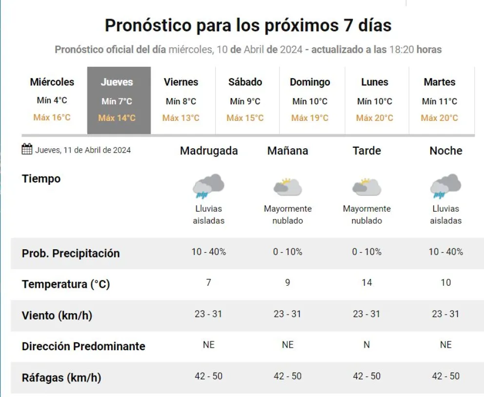 Para hoy se espera una jornada con cielo nublado, inestable con probabilidad de lluvias aisladas en la madrugada y en la noche. Se esperan vientos moderados del este-noreste, con ráfagas de hasta 50 km/h durante todo el día. En cuanto a las temperaturas, la mínima será de 9° y la máxima de 15°.