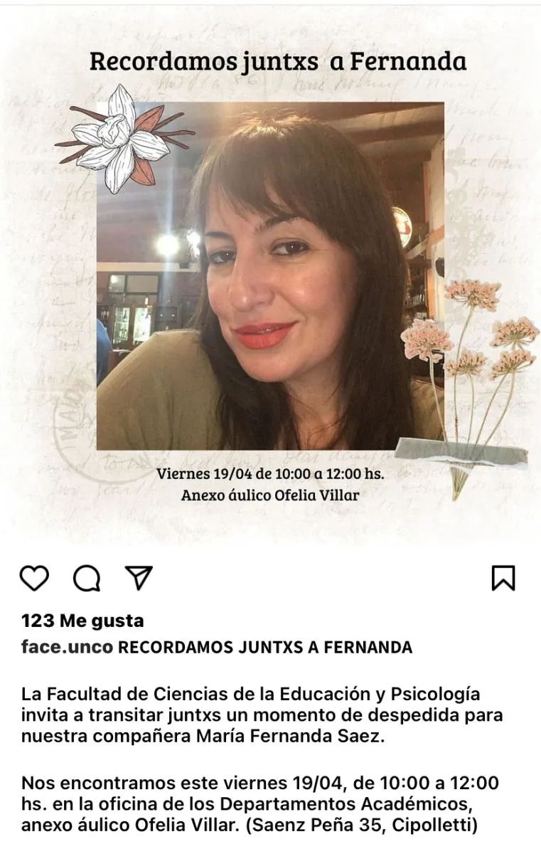 En medio del profundo pesar, la Facultad de Ciencias de la Educación y Psicología de la UNCo extendió  una invitación a la comunidad para participar en el acto de despedida de María Fernanda, la querida administrativa que falleció a principios de esta semana.