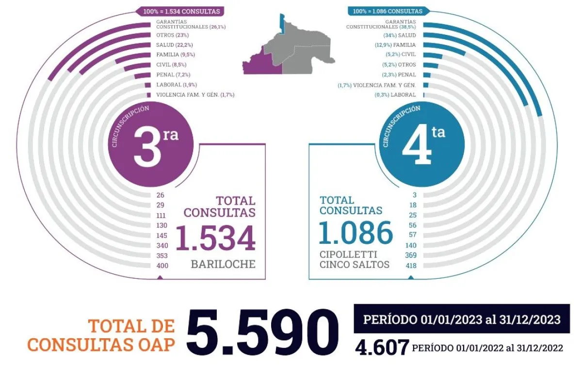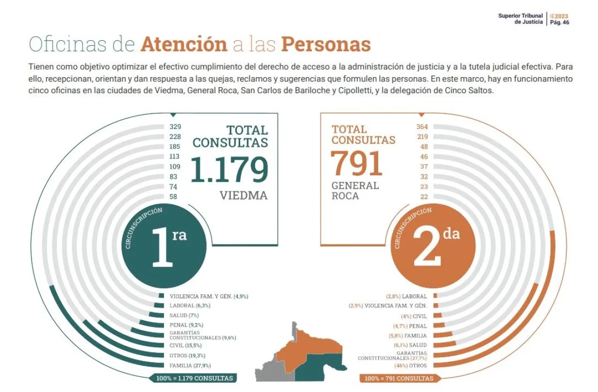 El Poder Judicial tiene cinco oficinas en las ciudades cabecera de circunscripción: Viedma, Roca, Bariloche y Cipolletti y una delegación en Cinco Saltos. Mientras que en 2022 recibieron 4.607 consultas, el número se incrementó a 5.590 intervenciones en 2023.