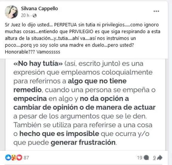 En otro posteo, Cappello enfatizó: “Sr Juez lo dijo usted... PERPETUA sin tutia ni privilegios.....como ignoro muchas cosas...entiendo que PRIVILEGIO es que siga respirando a esta altura de la situación...y..tutia....ahí va....así nos instruimos un poco....porque yo soy solo una madre en duelo...pero usted?”.