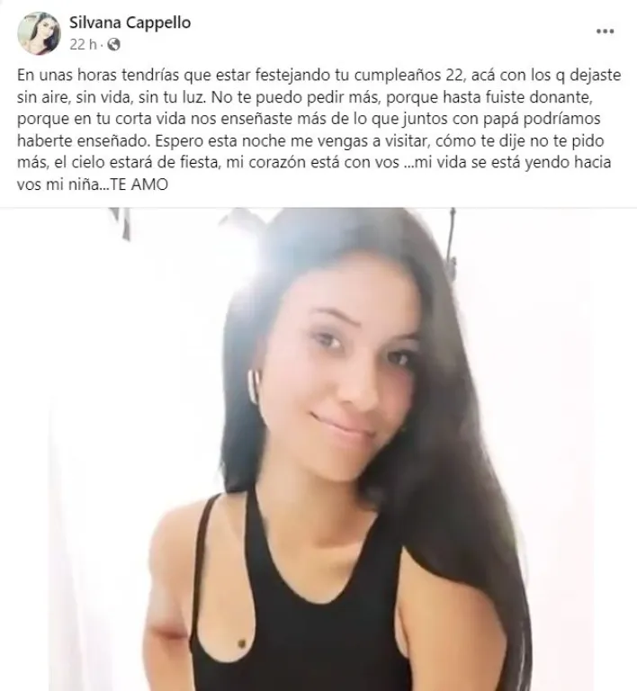 El primer posteo fue el sábado, horas antes del natalicio de Agustina. “En unas horas tendrías que estar festejando tu cumpleaños 22, acá con los q dejaste sin aire, sin vida, sin tu luz. No te puedo pedir más, porque hasta fuiste donante, porque en tu corta vida nos enseñaste más de lo que juntos con papá podríamos haberte enseñado”, expresó Silvana.
