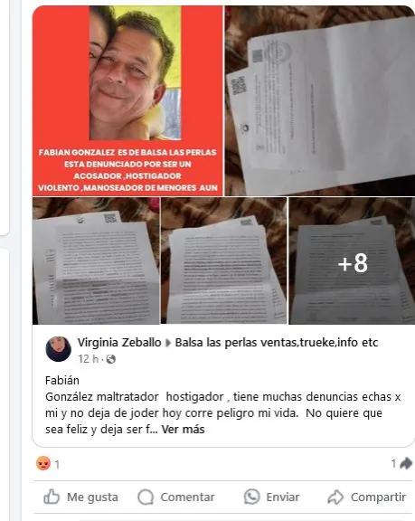 Una mujer que vive en Balsa Las Perlas realizó un dramático pedido de ayuda a través de las redes sociales. “Hoy mi vida corre peligro”, aseguró Virginia Zeballo, y responsabilizó a su ex pareja, Fabián González, de “maltratador y hostigador”. También expresó que “tiene muchas denuncias hechas por mi y no deja de joder”.