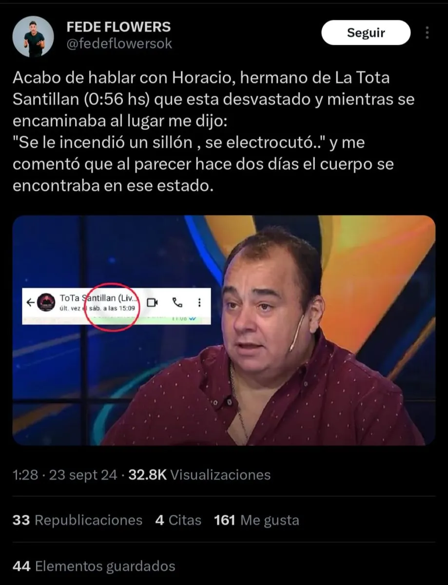 Según Fede Flowers, periodista especializado en temas de entretenimiento, Horacio, el hermano de Santillán, relató que Daniel murió de una forma trágica: “Se le incendió un sillón y se electrocutó”.Los informes preliminares sugieren que el cuerpo de Santillán había permanecido inerte durante dos días antes de ser encontrado.