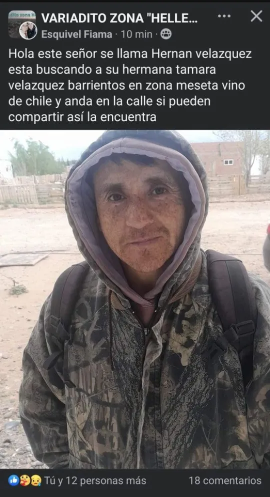 Ahora, también desde las redes sociales aparece la información sobre su regreso a la región. Una mujer publicó su foto afirmando que se llama “Hernán Velásquez”, que llegó desde Chile y que está buscando a su hermana, Tamara Velásquez Barrientos.
