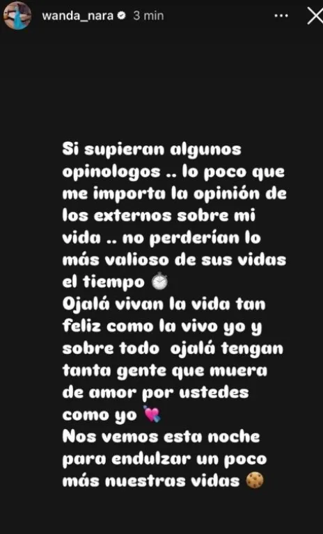 "Si supieran algunos opinólogos.. lo poco que me importa la opinión de los externos sobre mi vida. No perderían lo más valioso de sus vidas el tiempo. Ojalá vivan la vida tan feliz como la vivo yo y sobre todo ojalá tengan tanta gente que muera de amor por ustedes como yo", comentó Wanda.