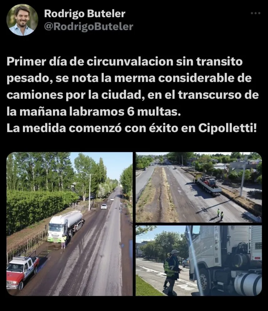 El intendente Rodrigo Buteler compartió en su cuenta de X los resultados positivos del primer día de la nueva normativa implementada en Cipolletti, que prohíbe el tránsito de camiones de carga pesada por la circunvalación de la ciudad.