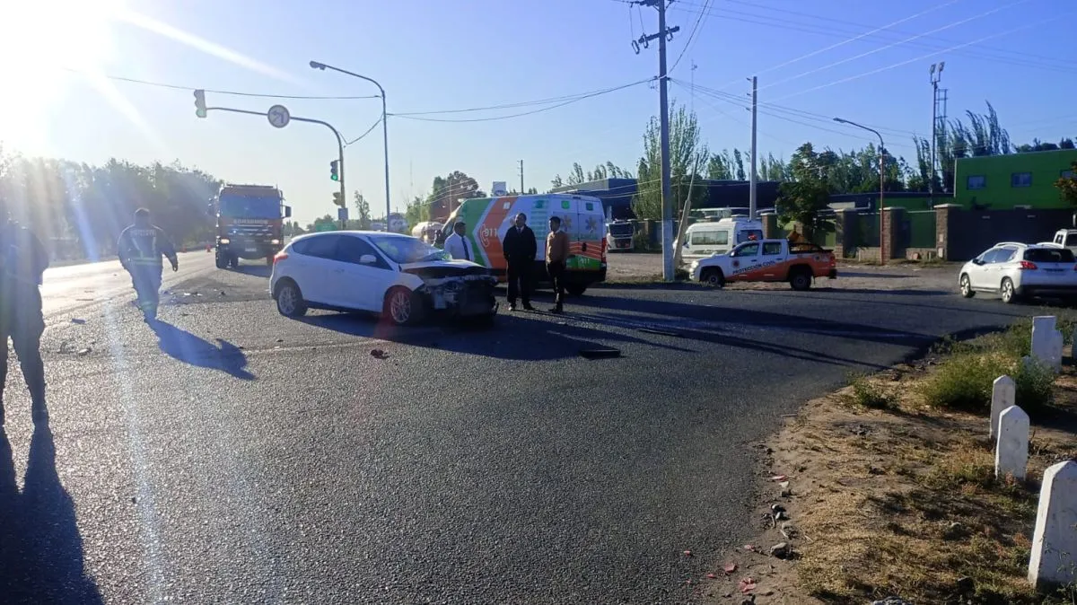 En las primeras horas del día, un accidente vial se registró en la intersección de la Ruta Nacional 22 y la calle Estado de Israel, cuando un Ford Focus, conducido por un masculino, cruzó un semáforo en rojo y chocó de manera fronto-lateral contra un colectivo de la empresa Via Bariloche.
