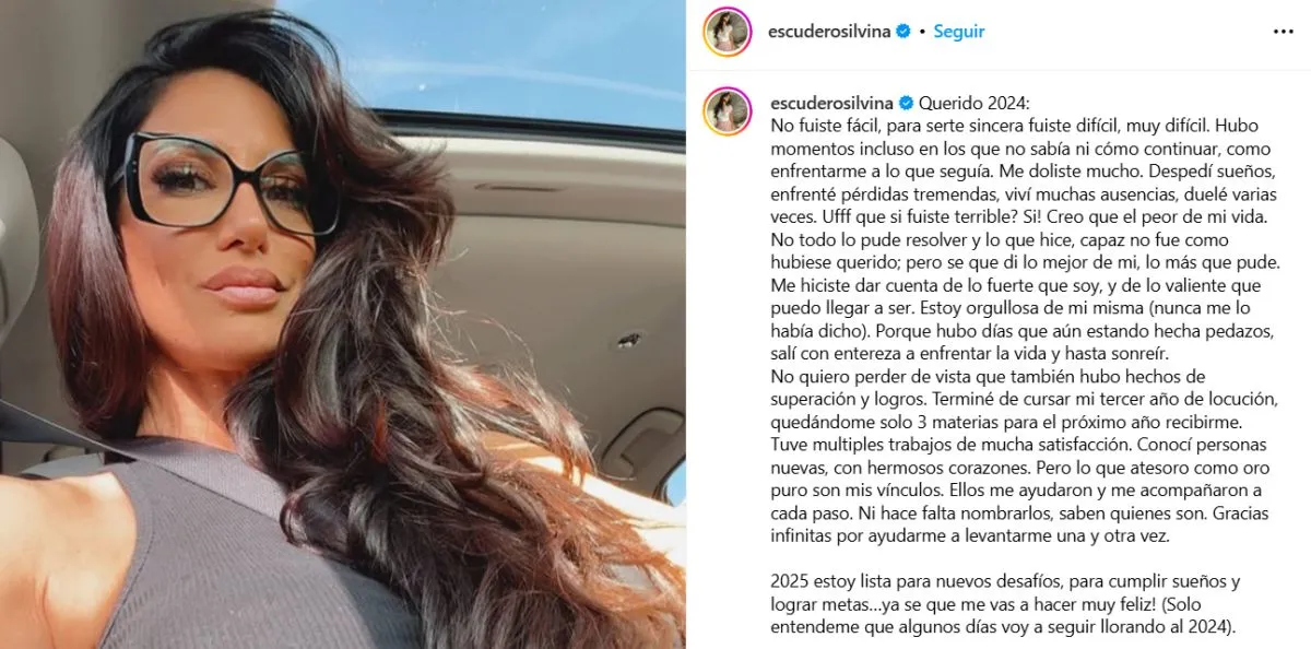 Silvina inicia su conmovedora carta con una franqueza inusual en el mundo del espectáculo, donde la perfección suele ser la norma. Con contundentes palabras, narra las dificultades que marcaron su camino: "Querido 2024", comienza, "no fuiste fácil, para serte sincera, fuiste difícil, muy difícil. Hubo momentos incluso en los que no sabía ni cómo continuar, como enfrentarme a lo que seguía". Esta declaración inicial ya marcaba un diagnóstico directo sobre un año que, en sus propios términos, la enfrentó con pérdidas, duelos y sueños rotos.
