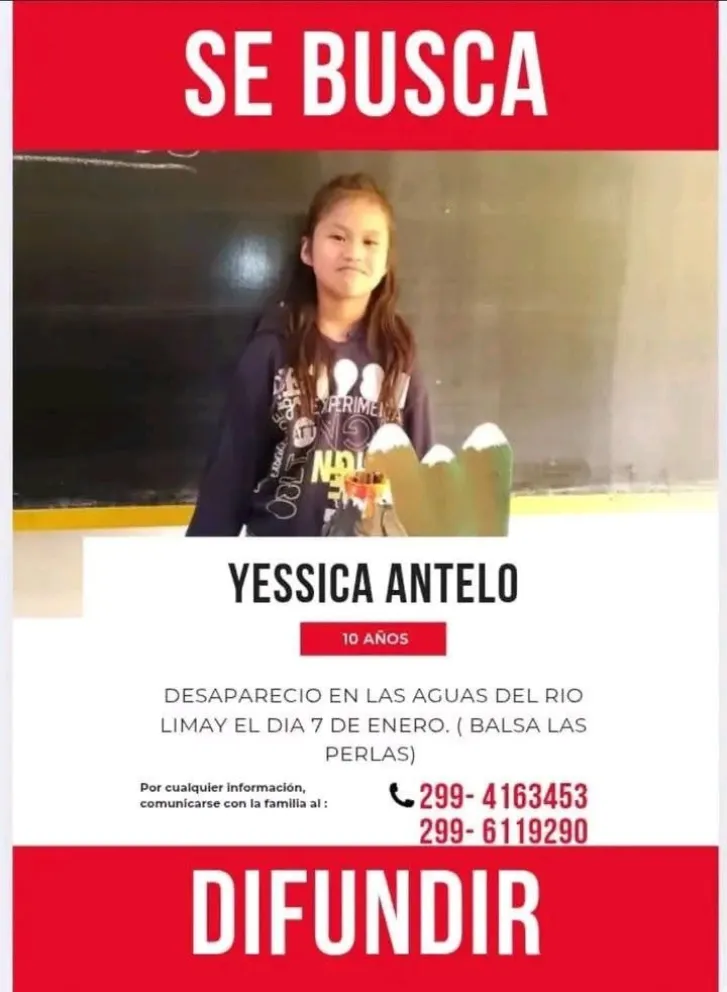 La búsqueda de Yésica, una niña de 9 años de Balsa Las Perlas, continúa sin descanso tras su desaparición el martes pasado en el río Limay. Según relató su madre, la tragedia ocurrió cuando la niña intentó salvar a su hermano de 13 años, quien estaba en peligro de ahogarse. La familia había elegido esa zona por considerarla de baja profundidad, ya que los chicos no saben nadar.