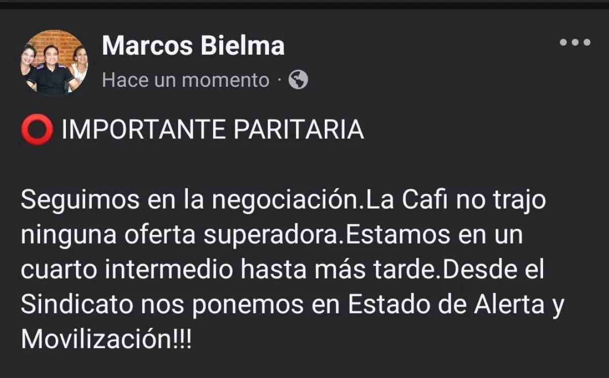 "Seguimos en la negociación. La CAFI no trajo ninguna oferta superadora. Estamos en un cuarto intermedio hasta más tarde. Desde el Sindicato nos ponemos en Estado de Alerta y Movilización".
