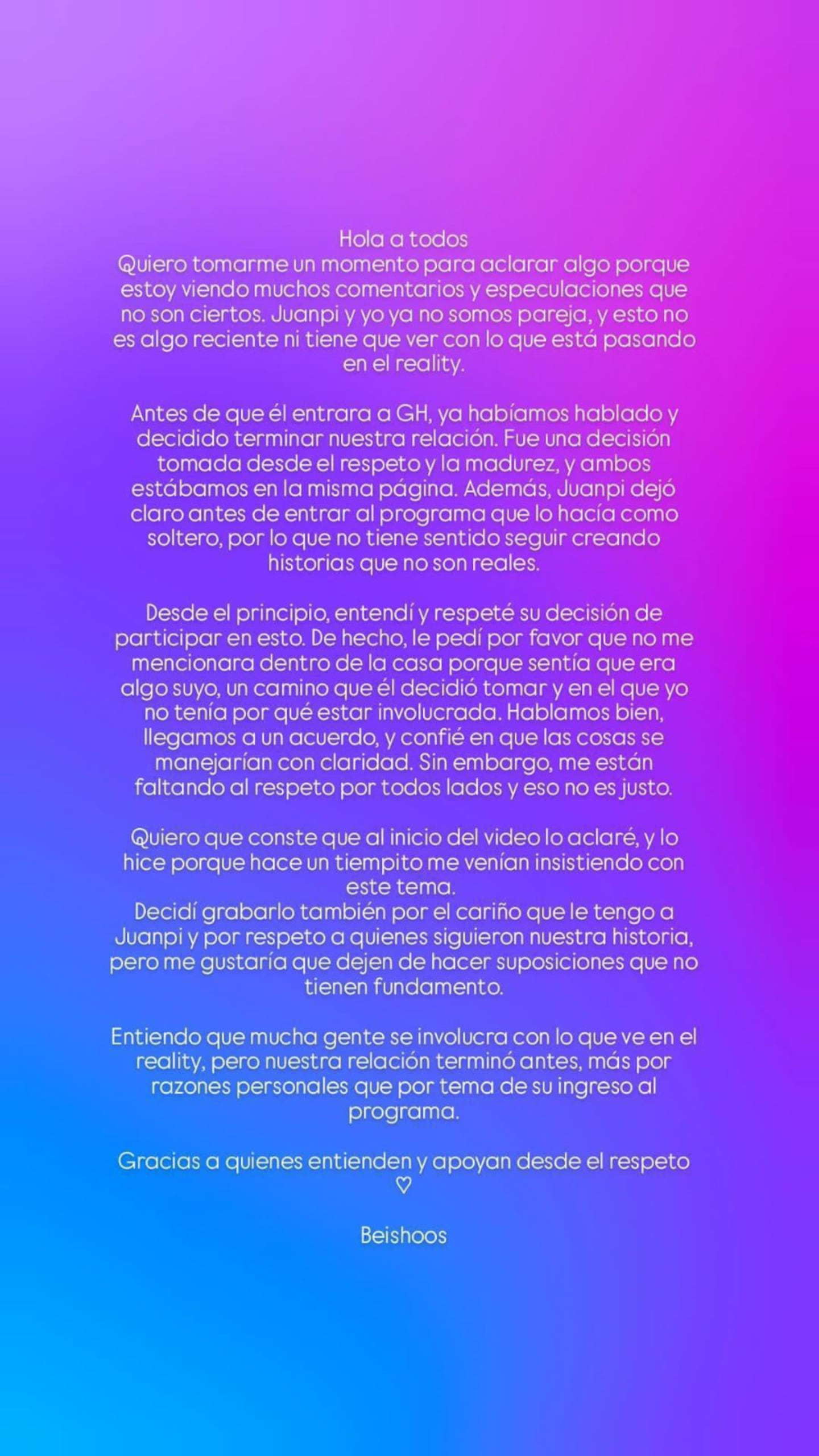 Esta comunicación concisa y directa fue interpretada por muchos como una muestra de desinterés o falta de empatía hacia Juan Pablo, un gesto que resonó fuertemente entre los seguidores del programa. La recepción por parte del público no fue la esperada, pues en vez de suavizar la situación, generó una ola de críticas que la incluso sugirieron que había utilizado a Juan Pablo para ganar fama. Sin embargo, en su video, ella fue enfática al aclarar algunos puntos respecto a su relación. Aseguró: "Juanpi y yo no somos pareja desde antes de que él participara en el reality. Nuestra ruptura ocurrió tras un diálogo sereno y de mutuo acuerdo y me parece imperativo que esto quede claro”.