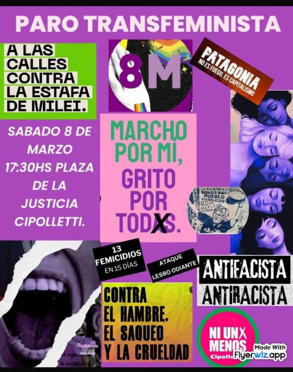 Además de la marcha, la jornada ha sido calificada como un "paro transfeminista", en el que se expresará un fuerte rechazo a las políticas del presidente Javier Milei, a quienes las organizadoras acusan de llevar adelante medidas que afectan especialmente a las mujeres y sectores vulnerables de la sociedad.