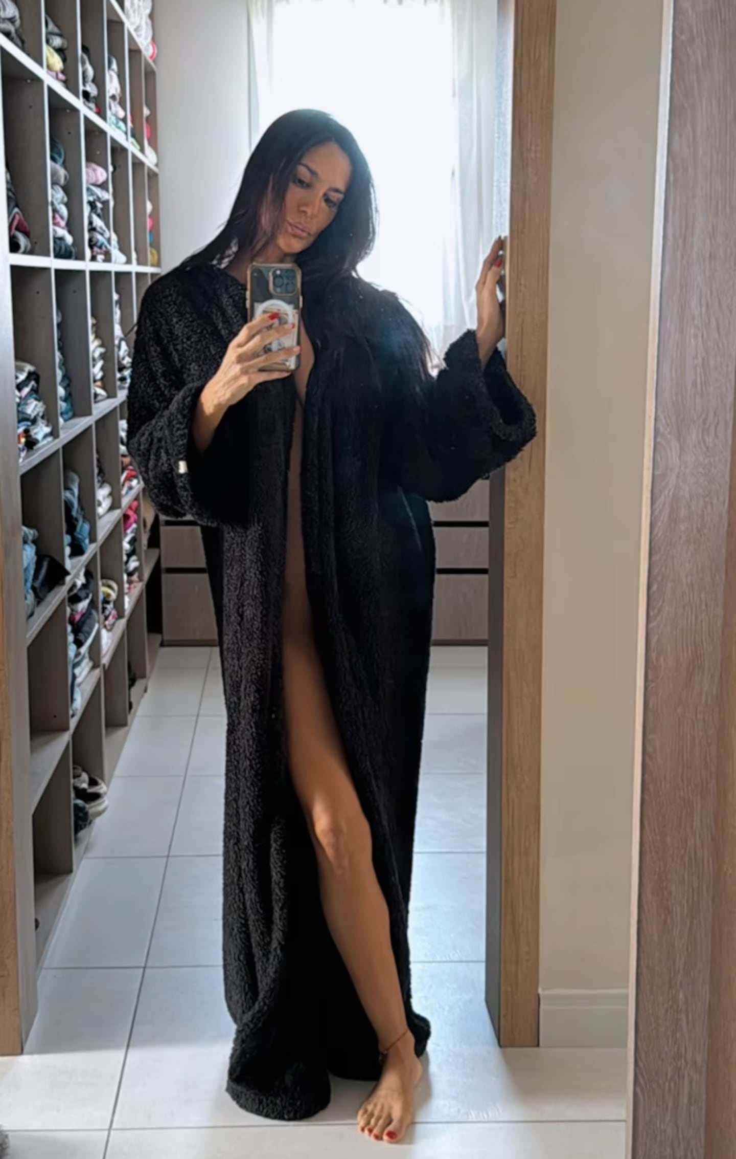 El factor sorpresa no se detuvo únicamente en la escenografía. Con una expresión que mezclaba sensualidad y desafío, extendió su mano hacia una pared cercana, mientras ligeramente lanzaba un beso dejando entrever su lado más provocador. Vestía solo un abrigo amplio, utilizado en ocasiones como pijama, que estratégicamente dejaba entrever que debajo de él no llevaba ropa interior.