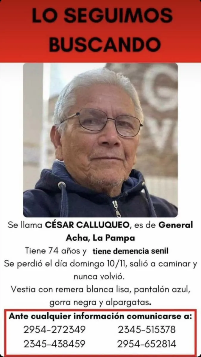 Este martes, la familia de César Calluqueo, un hombre de 75 años desaparecido desde el 10 de noviembre del año pasado en General Acha, La Pampa, llegó a la ciudad de Neuquén con una nueva esperanza. Una llamada reavivó las expectativas: un joven aseguró haberlo visto en el barrio Valentina Sur.