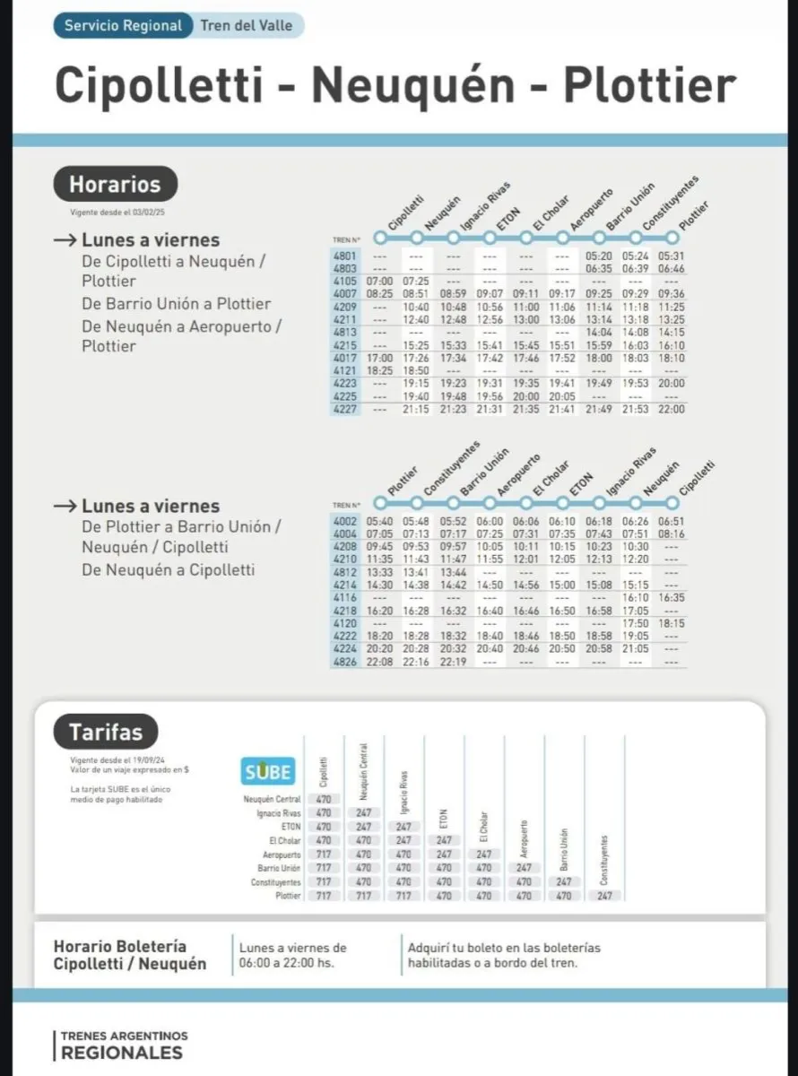 Desde hoy el Tren del Valle está funcionando nuevamente con su cronograma normal, publicado el primer día que volvió a funcionar el tren desde Cipolletti. Hace algunos días, por problemas con las unidades tras el incendio de una de ellas, se estaba manejando un diagrama especial, que dejaba sólo un horario de llegada y uno de salida desde Cipo.