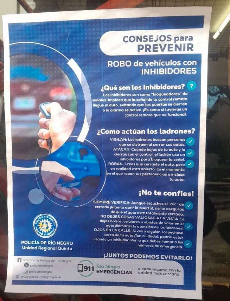 La Unidad Regional V de la policía provincial distribuyó afiches en comercios y lugares públicos para prevenir los robos con la utilización de los famosos “inhibidores” de alarmas y cierres centralizados. Se trata de una modalidad de robo que se ha incrementado en los últimos tiempos.