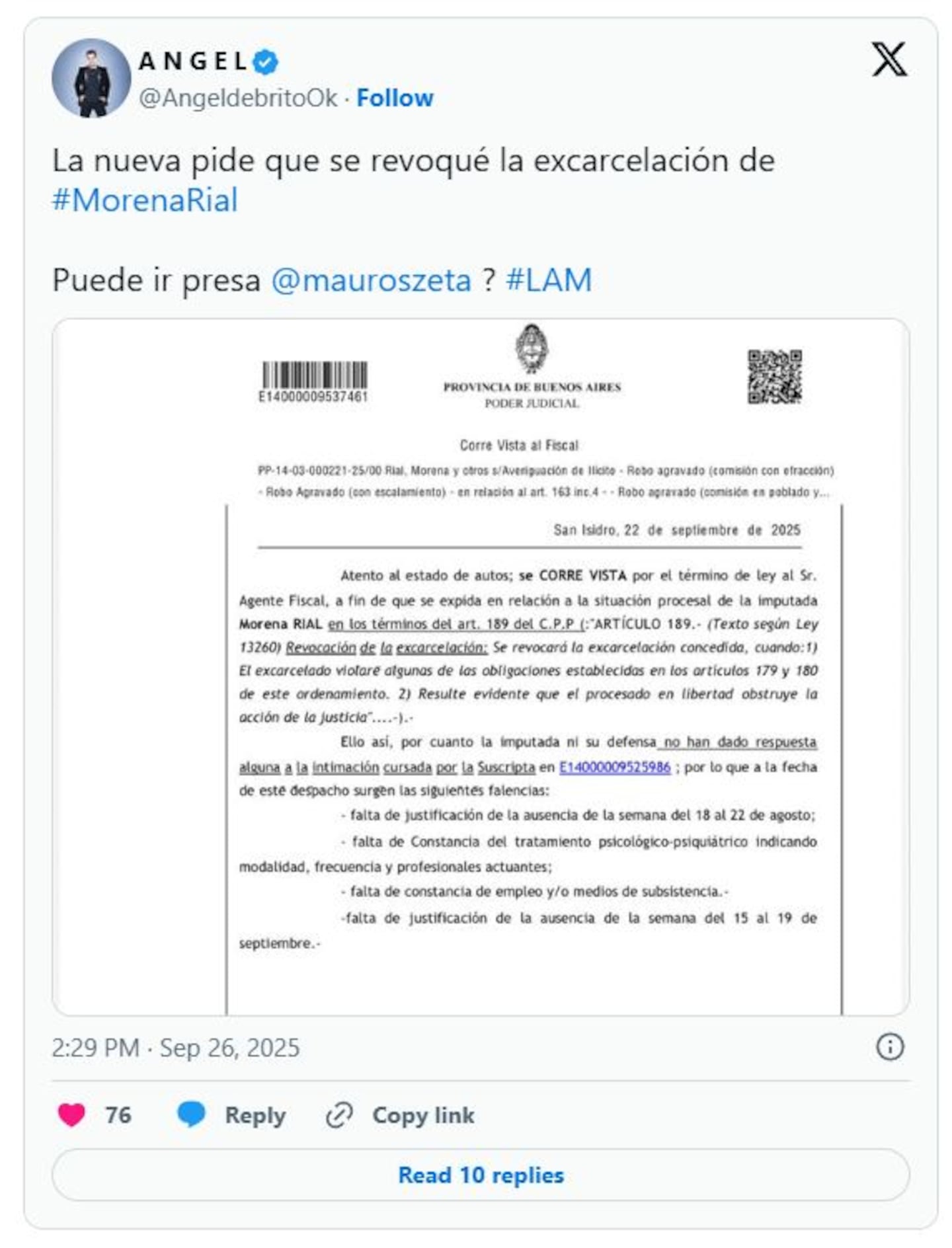 La noticia fue primero reportada por el célebre presentador de televisión Ángel de Brito, quien compartió el documento judicial en sus redes sociales. "La fiscalía pide que se revoque la excarcelación de Morena Rial. ¿Está en riesgo de volver a prisión?", preguntaba De Brito, una interrogante que muchos se han planteado mientras el caso avanza por los canales judiciales.