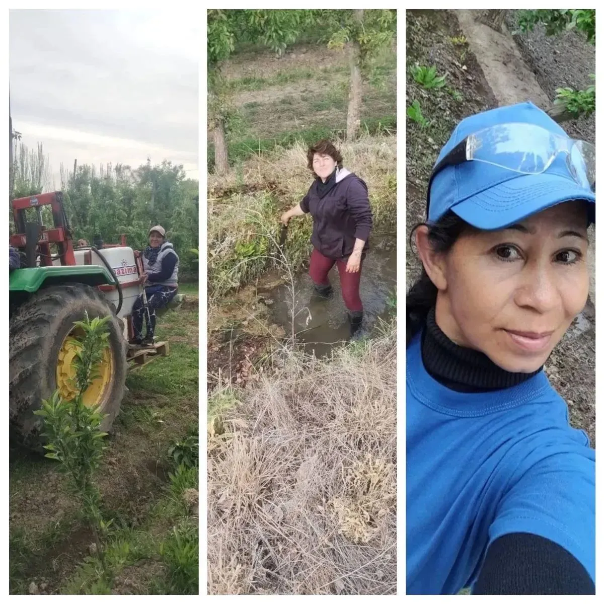 Las imágenes de PatriciaMaría Ángela y Susana resumen lo que ocurre cada amanecer en las chacras del Alto Valle. Mientras el agua corre por las acequias, ellas limpian, podan y preparan la tierra. Una de ellas se mete hasta las rodillas en el agua para destrabar el cauce y que el riego avance; otra arranca malezas para que la  planta respire.