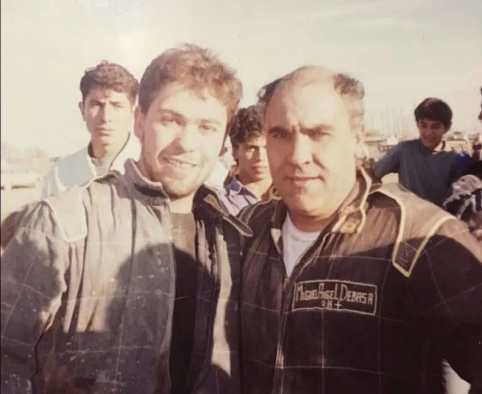 Miguel Debasa (der), y su hijo Maxi, en 1993, durante el debut del mayor de los herededors como navegante en un rally. Foto: gentileza.