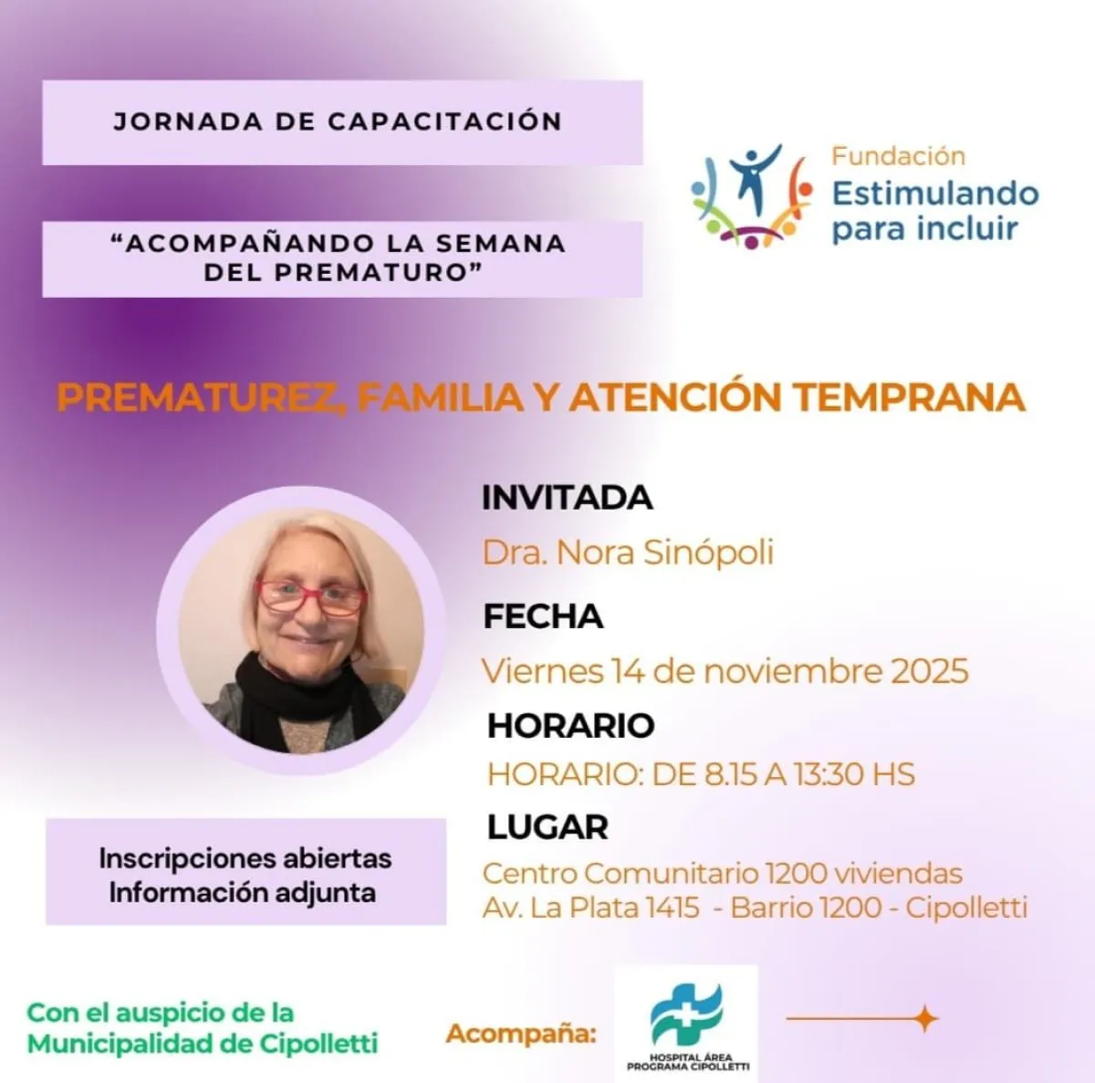 En el marco de la Semana del Prematuro, que se conmemora del 10 al 17 de noviembre y culmina con el Día Mundial de los Nacimientos Prematuros, la Fundación Estimulando para Incluir organiza una jornada de capacitación en Cipolletti. La actividad se llevará a cabo este viernes a partir de las 8:15 en el CPC de las 1200 Viviendas, y contará con la participación de la especialista en atención temprana Nora Sinópoli, consultora del Hospital Garrahan.
