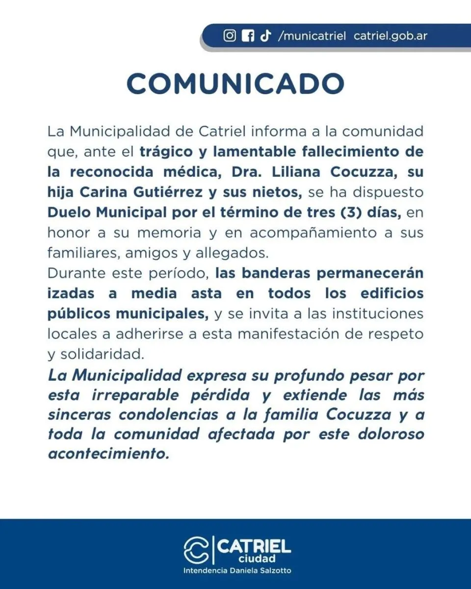 La Municipalidad de Catriel decretó tres días de duelo y publicó un mensaje en el que lamentó “el trágico y lamentable fallecimiento” de la profesional. Las banderas fueron izadas a media asta en todos los edificios públicos y se invitó a las instituciones locales a adherirse. El municipio expresó “su profundo pesar por esta irreparable pérdida” y extendió condolencias a la familia Cocuzza y a toda la comunidad afectada.
