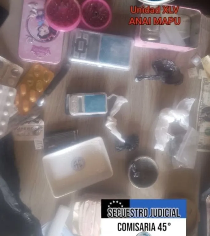 Durante la diligencia se obtuvieron resultados positivos: se halló una sustancia compatible con clorhidrato de cocaína y materia vegetal compacta que arrojó resultado positivo para cannabis sativa, además de dos balanzas de precisión y varios medicamentos, entre ellos aspirinas, paracetamol, ibuprofeno y comprimidos de clonazepam.