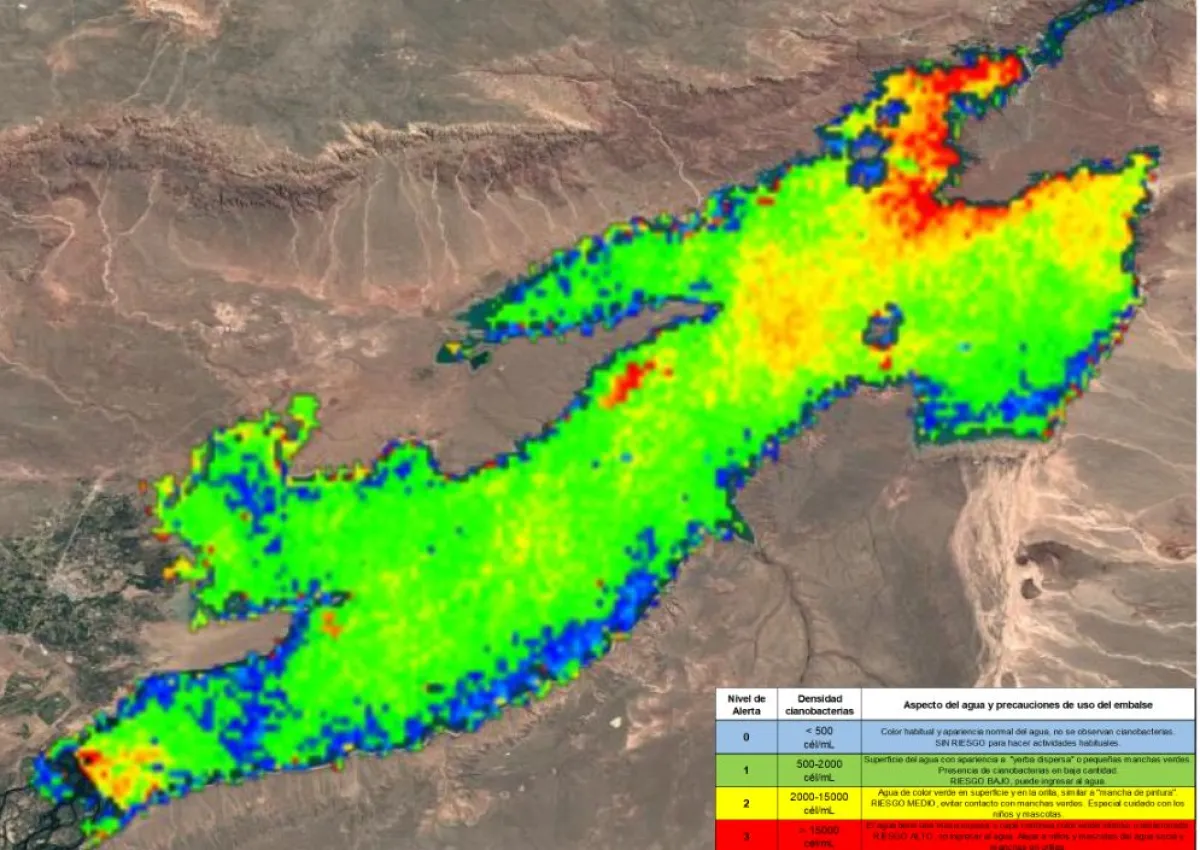 El mapa muestra los espacios donde se concenran las cianobacterias. Imagen: gentileza AIC.