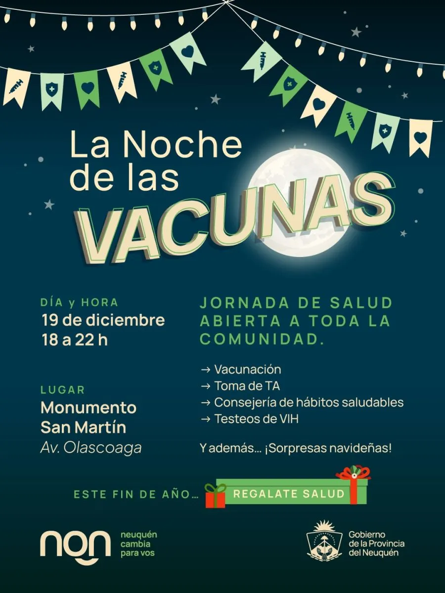 La jornada se realizará este viernes entre las 18 y las 22 horas, y contará con puestos de vacunación en el Hospital Castro Rendón, el Hospital Heller, el Hospital Bouquet Roldán, el Centro de Salud Progreso y el sector del Monumento a San Martín. Además, se sumó la Clínica de Imágenes del grupo Levensalud, ubicada en Santa Fe 273, ampliando así la oferta para quienes circulen por el centro de la ciudad. También habrá múltiples puntos habilitados en distintas localidades de la provincia, cuyos detalles pueden consultarse en el Instagram del Ministerio de Salud de Neuquén.