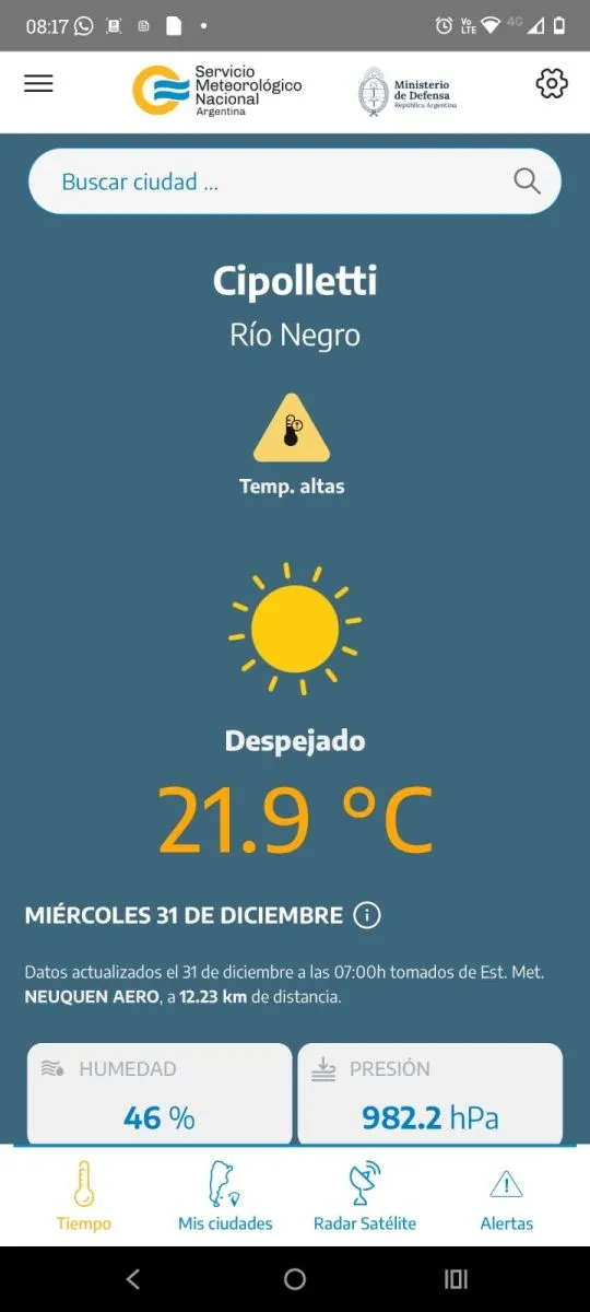 Imagen de la app del SMN con la información de Cipolletti: la advertencia por altas temperaturas. Foto: captura de pantalla.