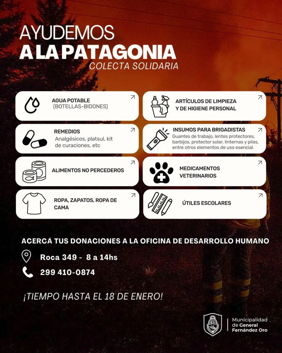 Ante la compleja situación que atraviesan distintas localidades de la Patagonia como consecuencia de los incendios, el Municipio de Fernández Oro lanzó una campaña solidaria con el objetivo de reunir donaciones destinadas a las personas afectadas, a quienes trabajan en el combate del fuego y a los animales damnificados.
