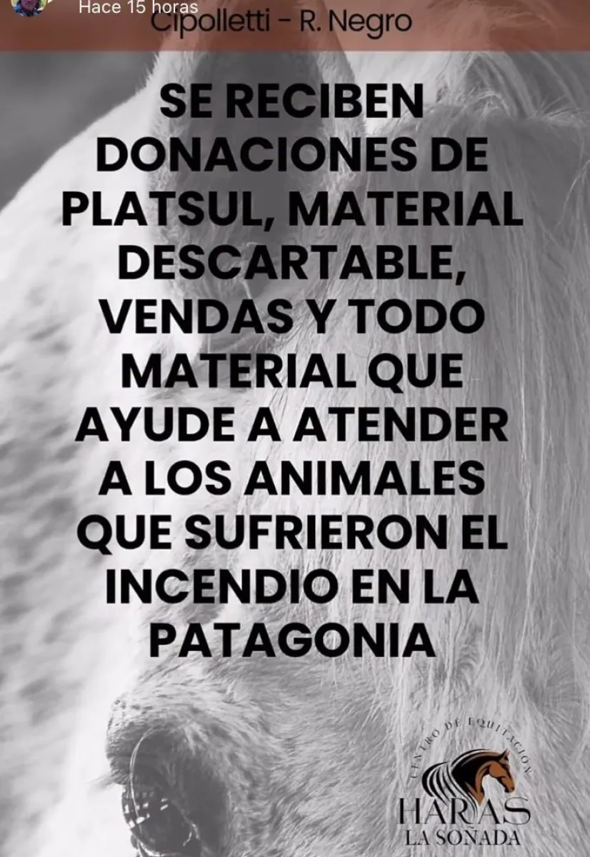 Los incendios que afectan a distintas zonas de la Patagonia no solo dejaron daños materiales y ambientales, sino también un fuerte impacto en los animales que habitan esas áreas. Frente a este escenario, desde Haras La Soñada hicieron un pedido a la solidaridad para ayudar a los caballos y otros animales que sufrieron quemaduras y lesiones por los fuegos.