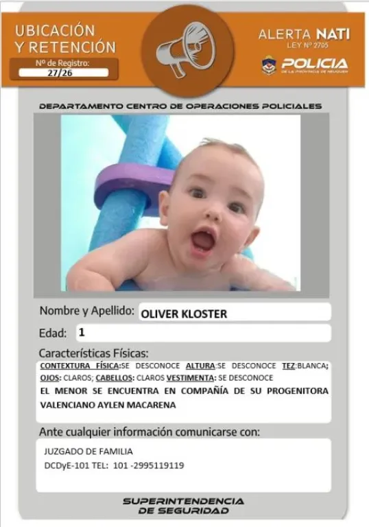 La Policía de la provincia de Neuquén activó este jueves por la tarde un Alerta Nati por la desaparición de un bebé de un año, identificado como Oliver Kloster, quien se habría ausentado en compañía de su madre. La situación generó una inmediata movilización de las fuerzas de seguridad y un pedido urgente de colaboración a la comunidad.
