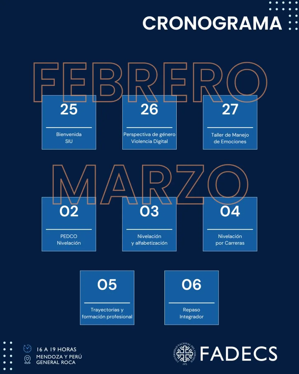A lo largo de las dos semanas, los estudiantes recorrerán contenidos que van desde el manejo de las plataformas digitales institucionales hasta talleres de reflexión sobre el manejo de emociones y la perspectiva de género en el ámbito universitario. Quienes deseen más información, pueden contactarse a la cuenta de Instagram @fadecs