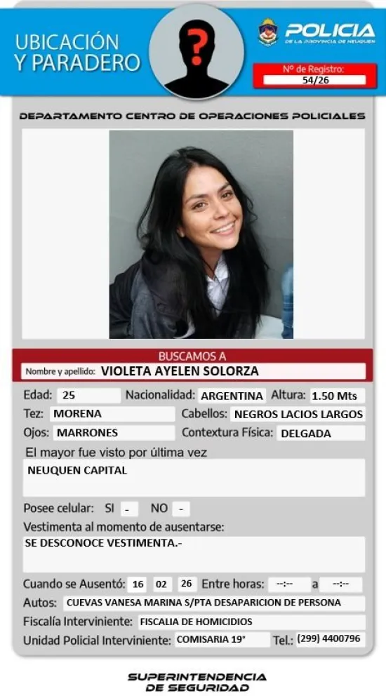 La Policía de la provincia de Neuquén emitió un alerta de ubicación y paradero para dar con el paradero de Violeta Ayelén Solorza, una joven de 25 años que fue vista por última vez el pasado 16 de febrero en Neuquén. Desde entonces, no se tienen novedades sobre su paradero.