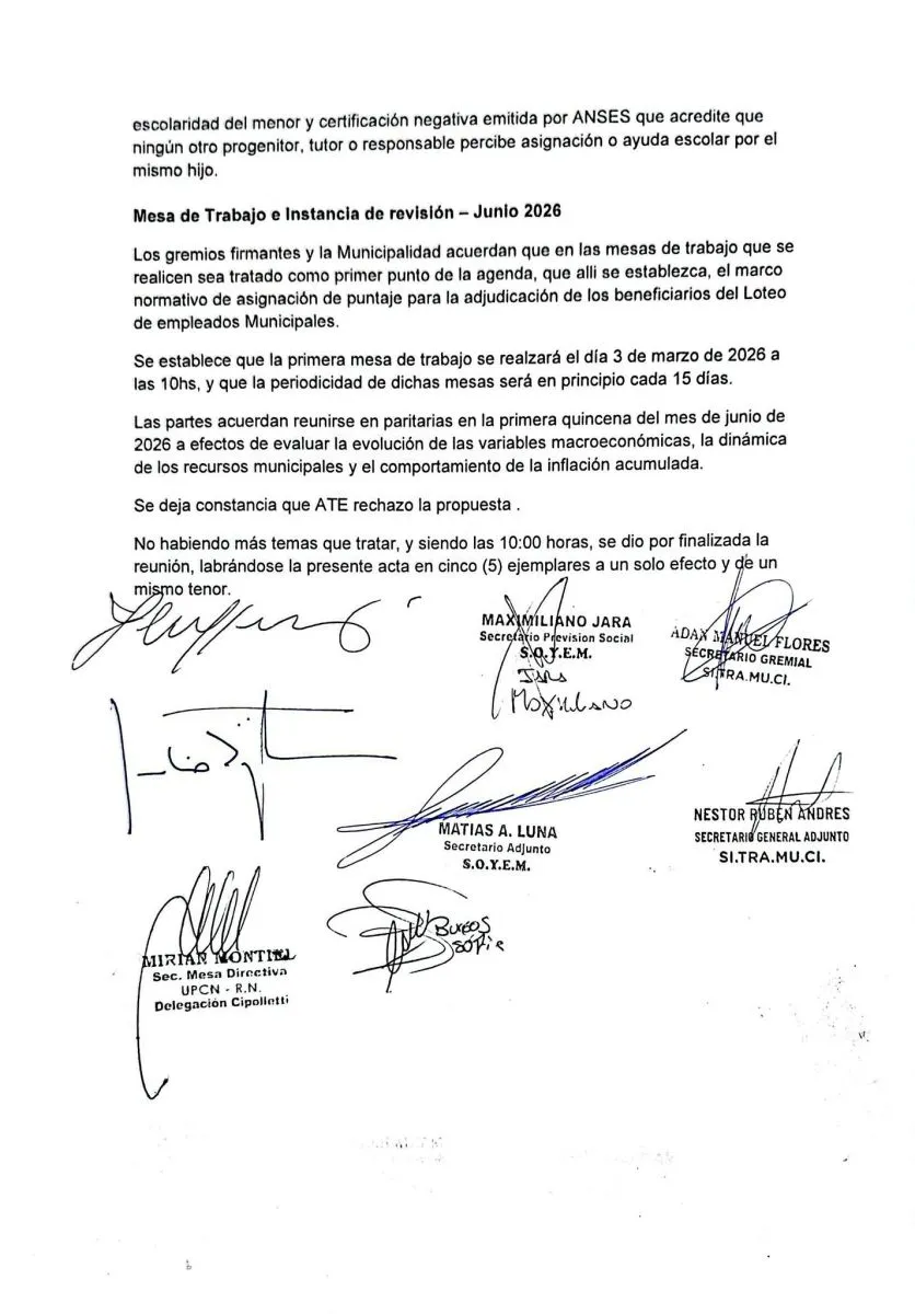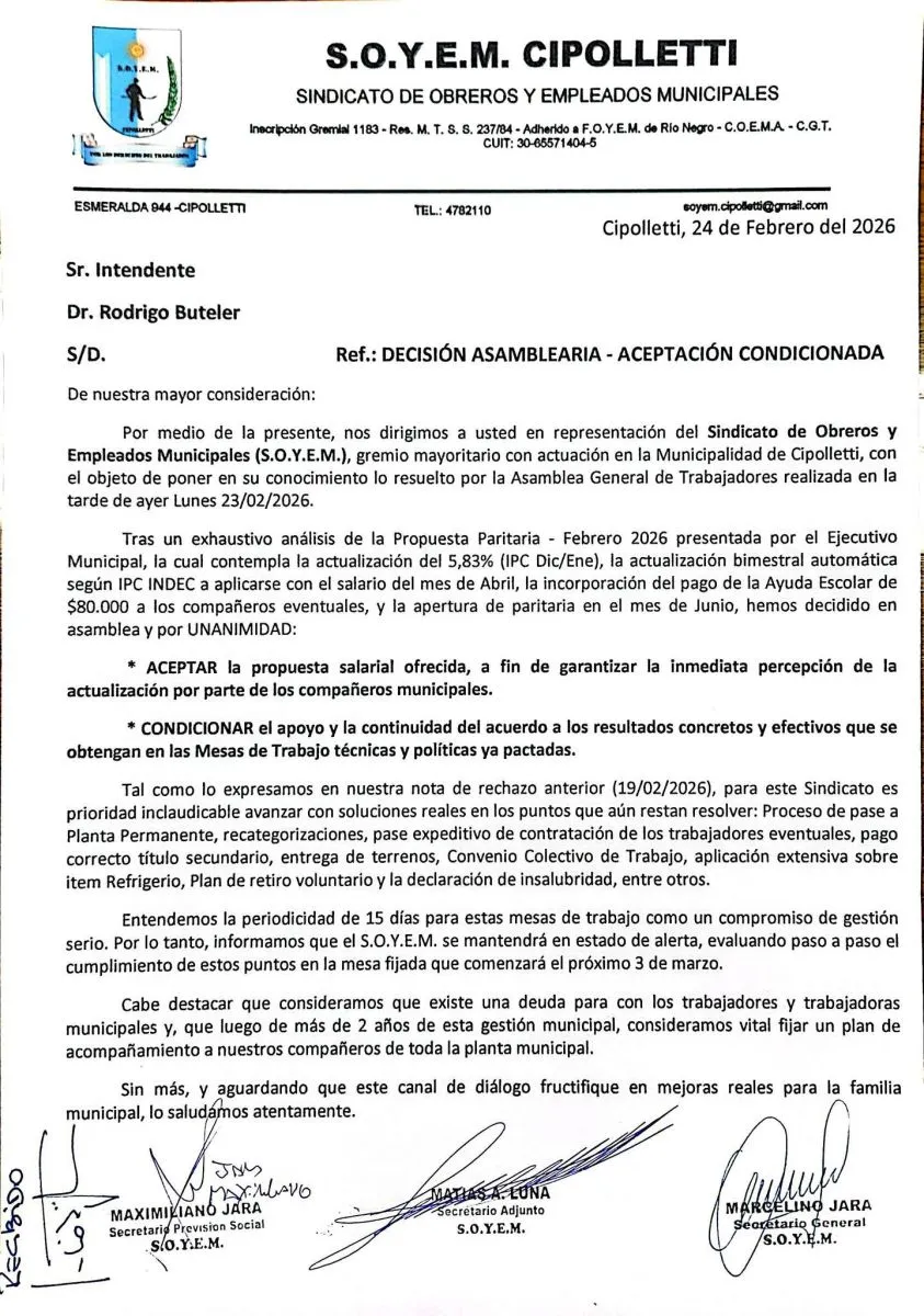En el caso de SOYEM, el gremio nformó que la firma del acuerdo fue resuelta en asamblea y quedó supeditada al avance de las mesas de trabajo que comenzarán el 3 de marzo. La organización presentó además una nota formal al intendente Rodrigo Buteler dejando constancia de que el acompañamiento está condicionado a obtener respuestas concretas a una serie de reclamos laborales.